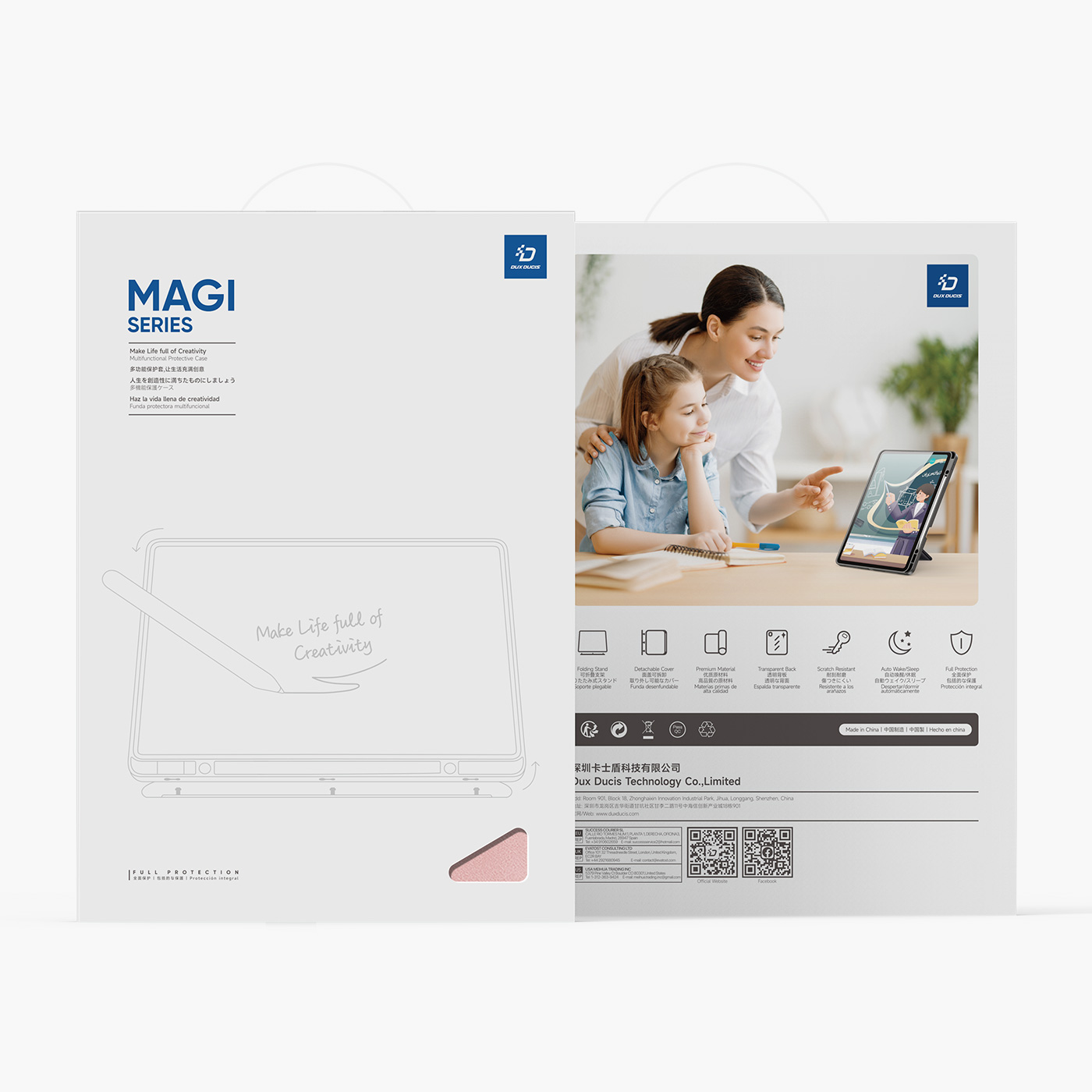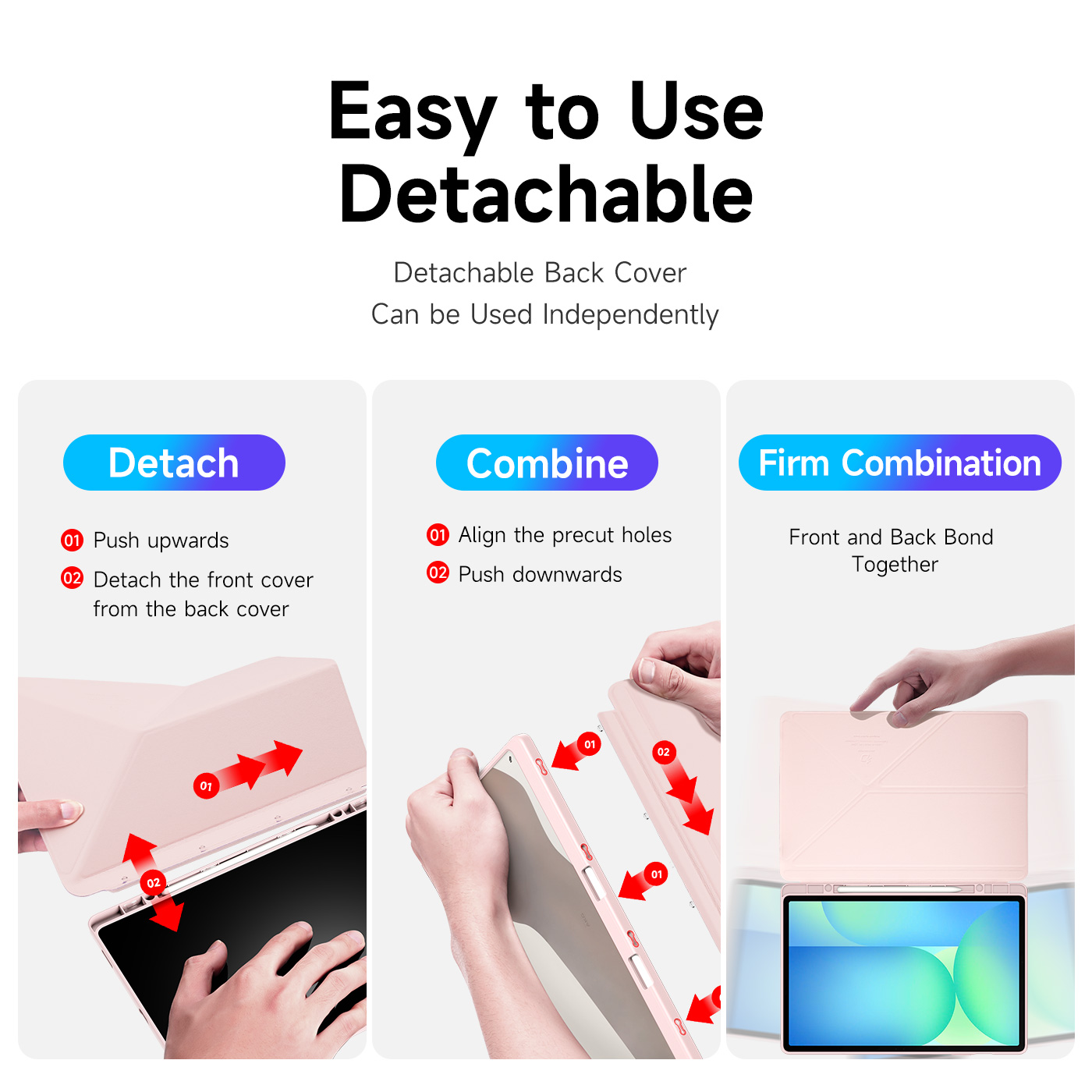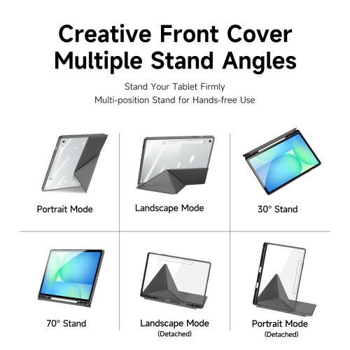 Creative front cover offers multiple stand angles to free your hands when viewing, browsing on the tablet. Clear back cover can be detached from the front cover and used independently, which is perfect for playing games on the tablet.