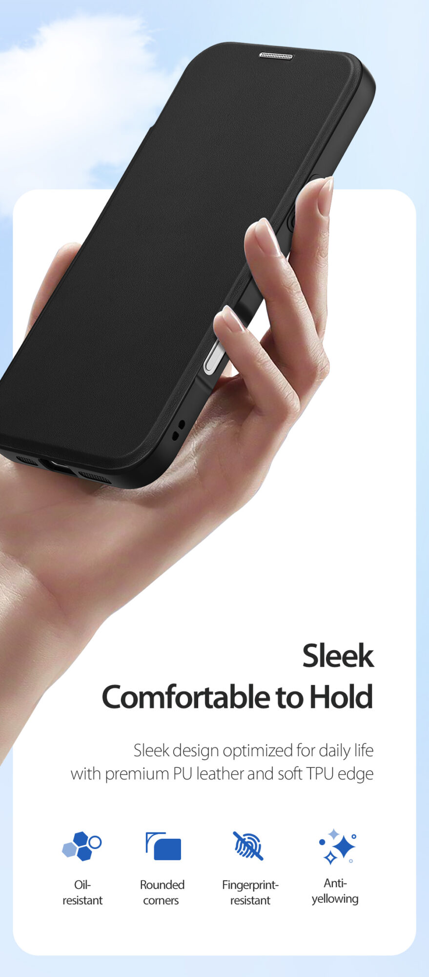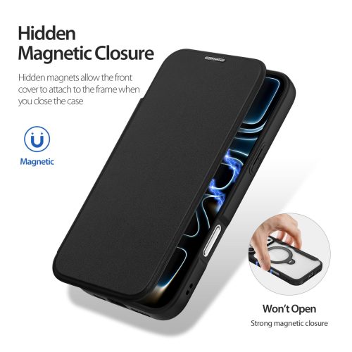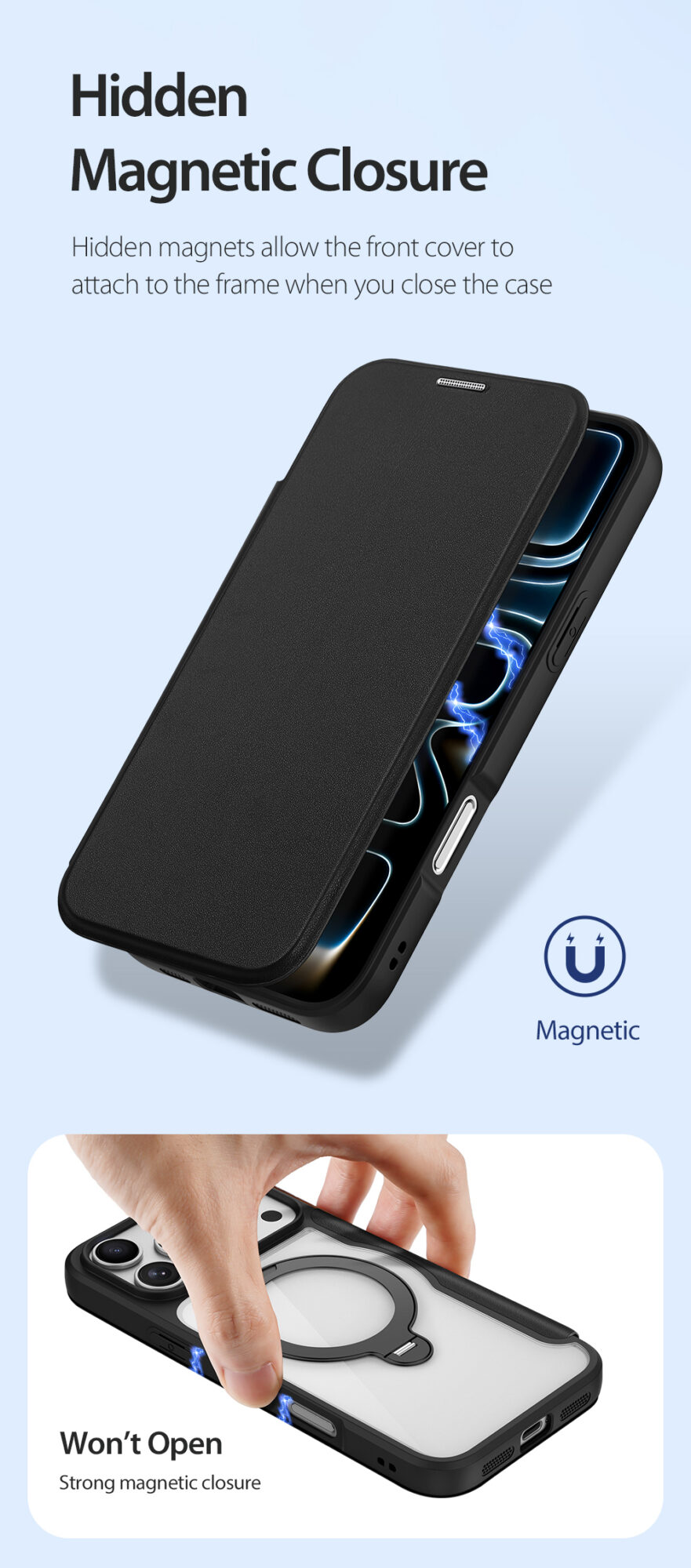 Hidden magnets allow the front cover to attach to the frame when you close the case, strong magnetic closure keeps your phone encased in the case.