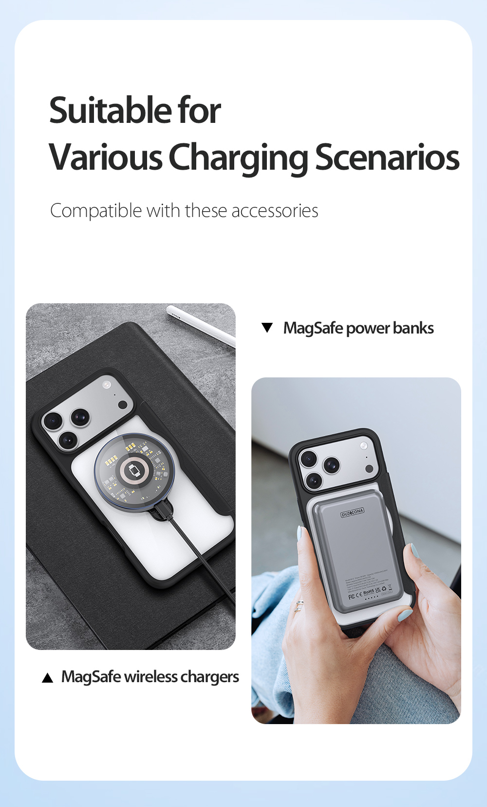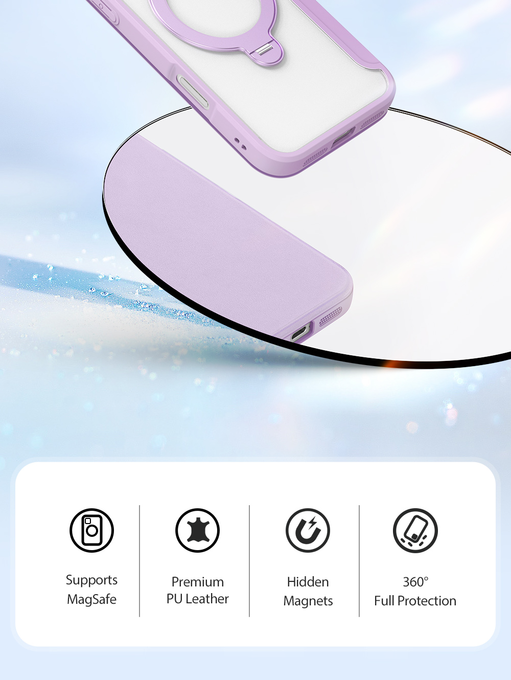 The world’s first folio case with MagSafe, it works with Apple’s MagSafe chargers, wallets, power banks. When it’s time to charge your phone, just leave the case on your phone and attach to your MagSafe charger.